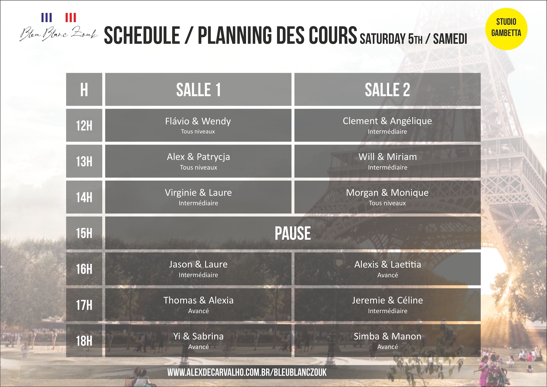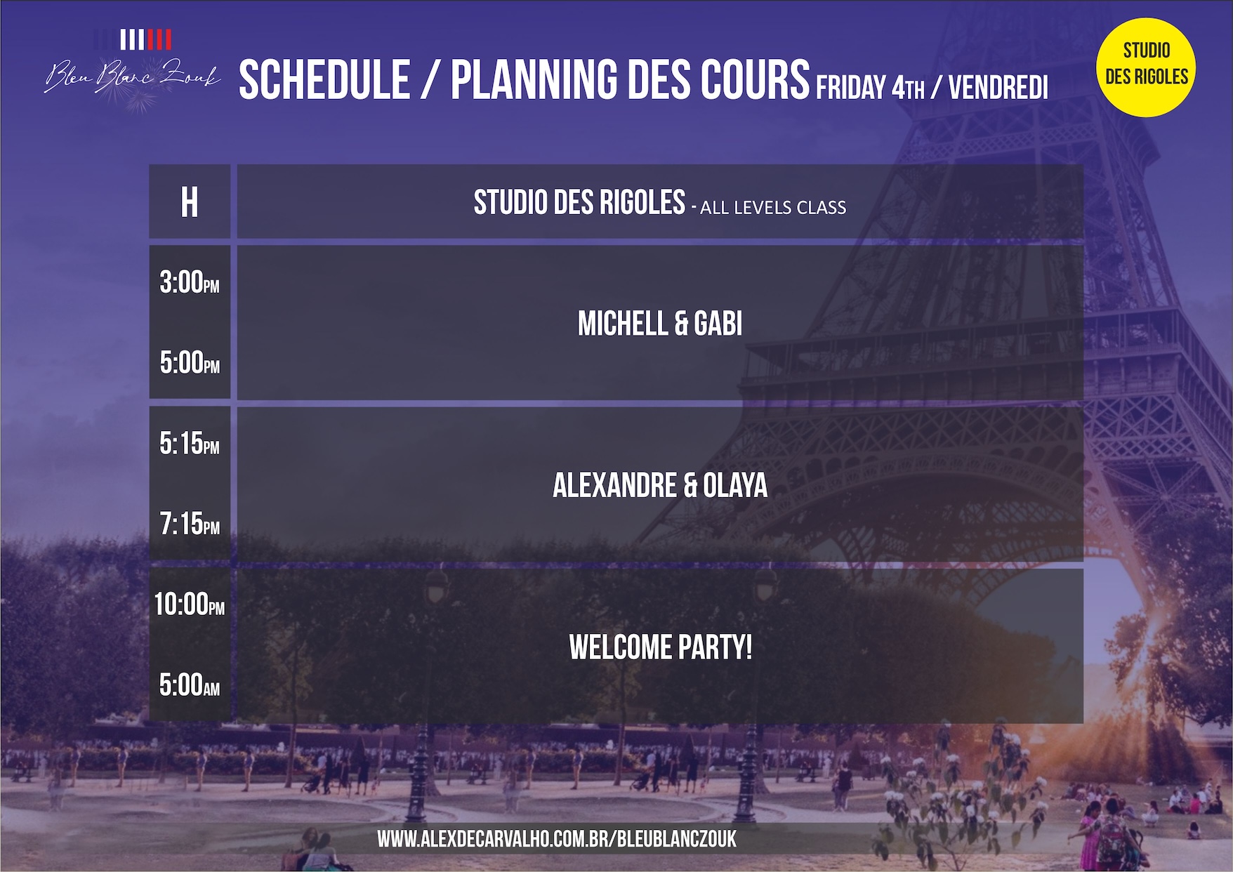 - From 3:00pm to 7:15pm Special Workshops with Michell & Gabi and Alexandre & Olaya!